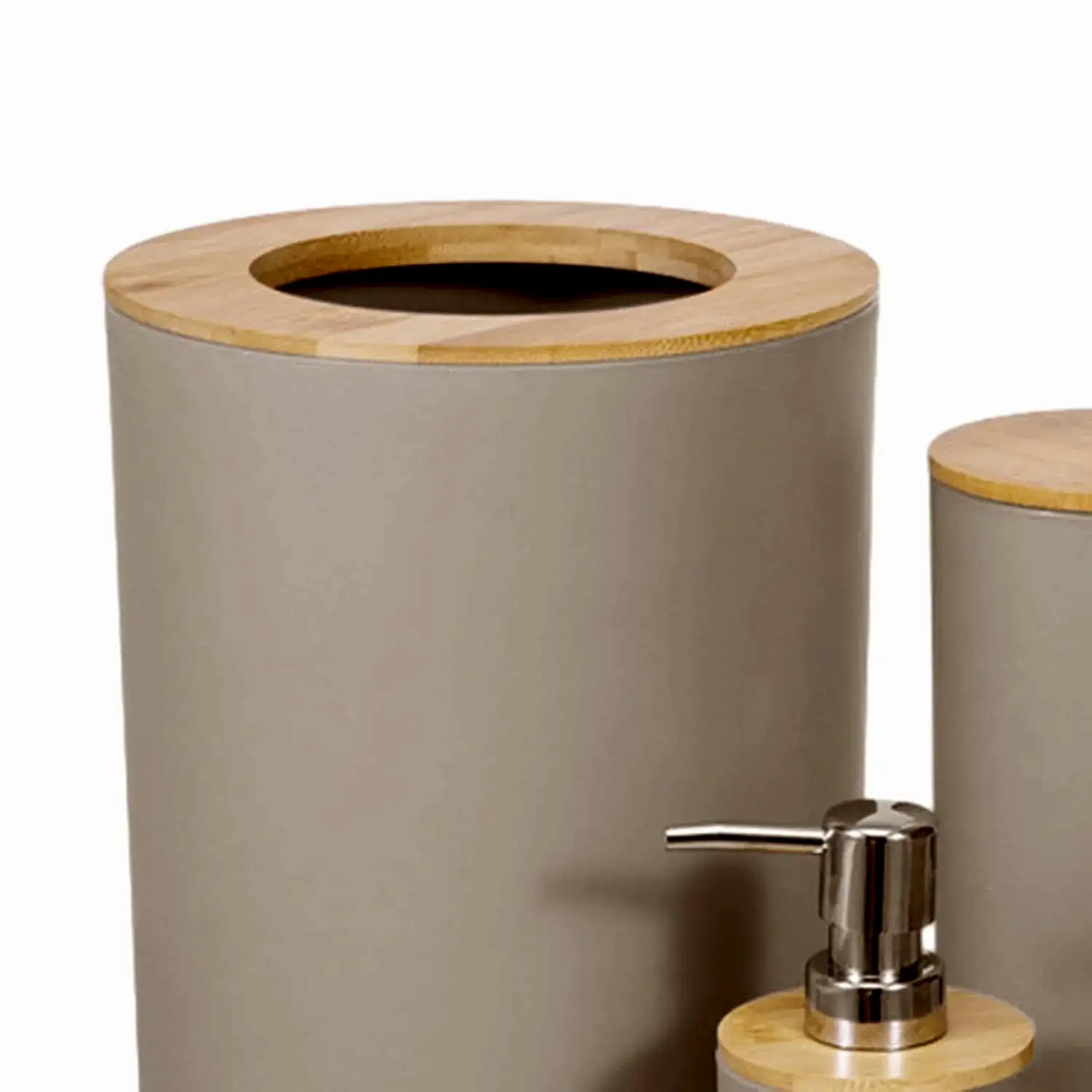 Şık bir banyo seti ; tuvalet fırçası, çöp kutusu, sabunluk, sabunluk, diş fırçası tutacağı ve diş fırçası kabı içermektedir .