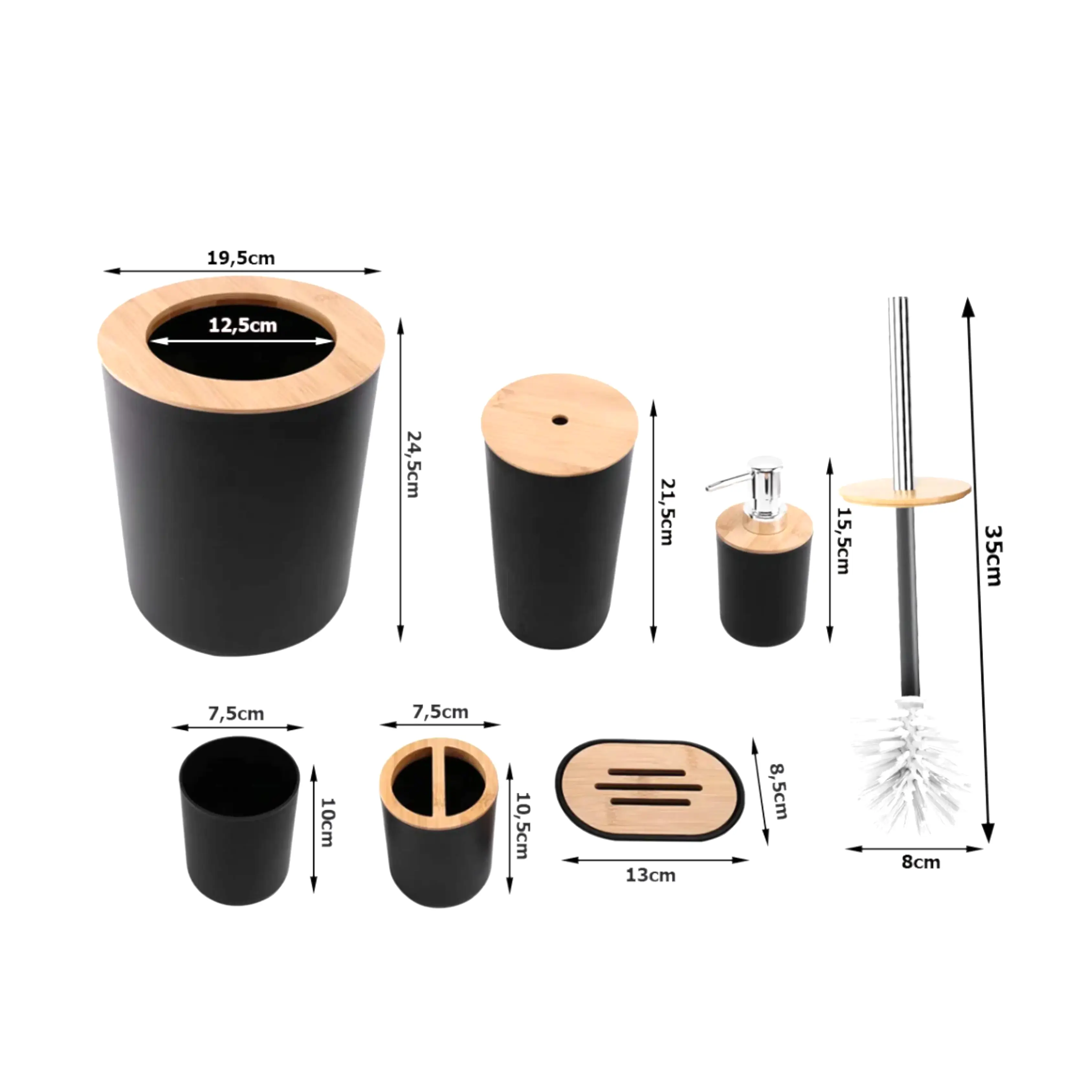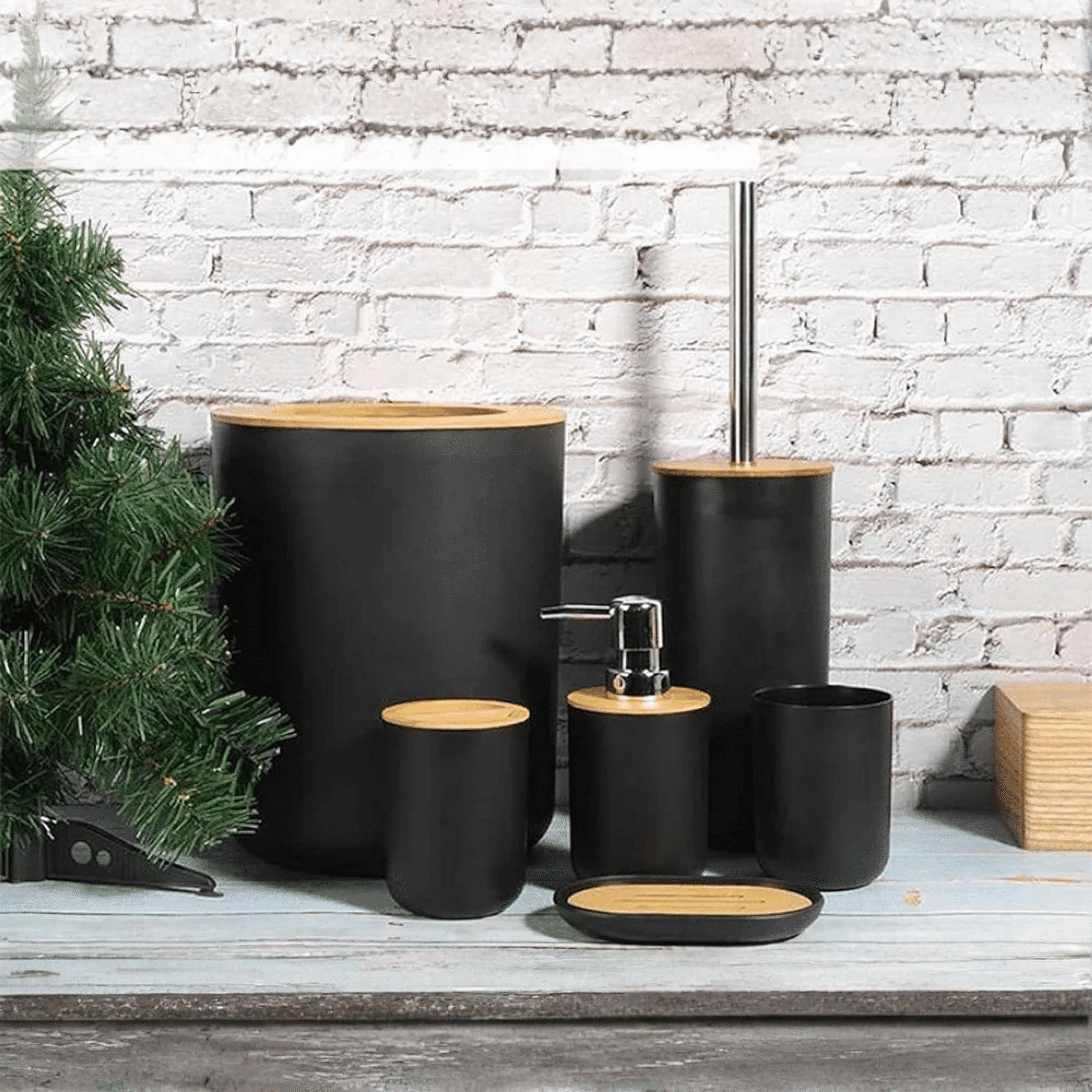 Şık bir banyo seti ; tuvalet fırçası, çöp kutusu, sabunluk, sabunluk, diş fırçası tutacağı ve diş fırçası kabı içermektedir .